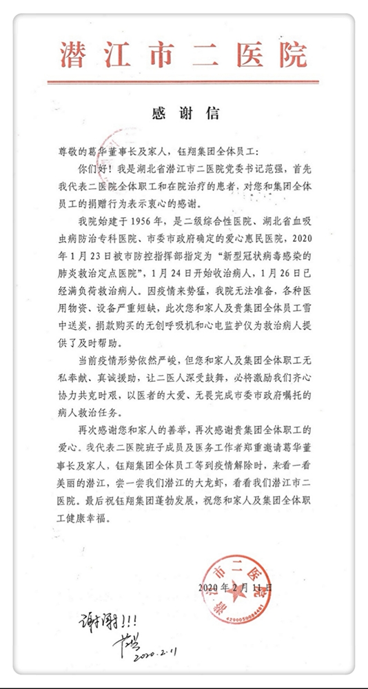 我院始建于1956年,是二級綜合性醫(yī)院,湖北省血吸蟲病防治專科醫(yī)院,市委、市政府確定的愛心惠民醫(yī)院。2020年1月23日被市防控指揮部指定為新型冠狀病毒感染的肺炎救治定點醫(yī)院,1月24日開始收治病人,1月26日已經(jīng)滿負荷救治病人。因疫情來勢兇猛,我院無法準備,各種醫(yī)用物資、設備嚴重短缺,此次您和家人及貴集團全體員工雪中送炭捐款購買的無創(chuàng)呼吸機和心電監(jiān)護儀,為救治病人提供了及時幫助。當前疫情形勢依然嚴峻,但您和家人、集團員工無私奉獻、真誠援助,讓二醫(yī)人深受鼓舞,必將激勵著我們齊心協(xié)力共克時艱,以醫(yī)者大愛、無畏,完成市委、市政府布置的病人救治任務。再次感謝您及家人的善舉,再次感謝貴集團全體職工的愛心。我代表二醫(yī)院班子成員及醫(yī)務工作者鄭重邀請葛華董事長與家人、鈺翔集團全體員工等到疫情結束時來看一看美麗的潛江,嘗一嘗我們潛江的小龍蝦,看一看我們潛江市二醫(yī)院。